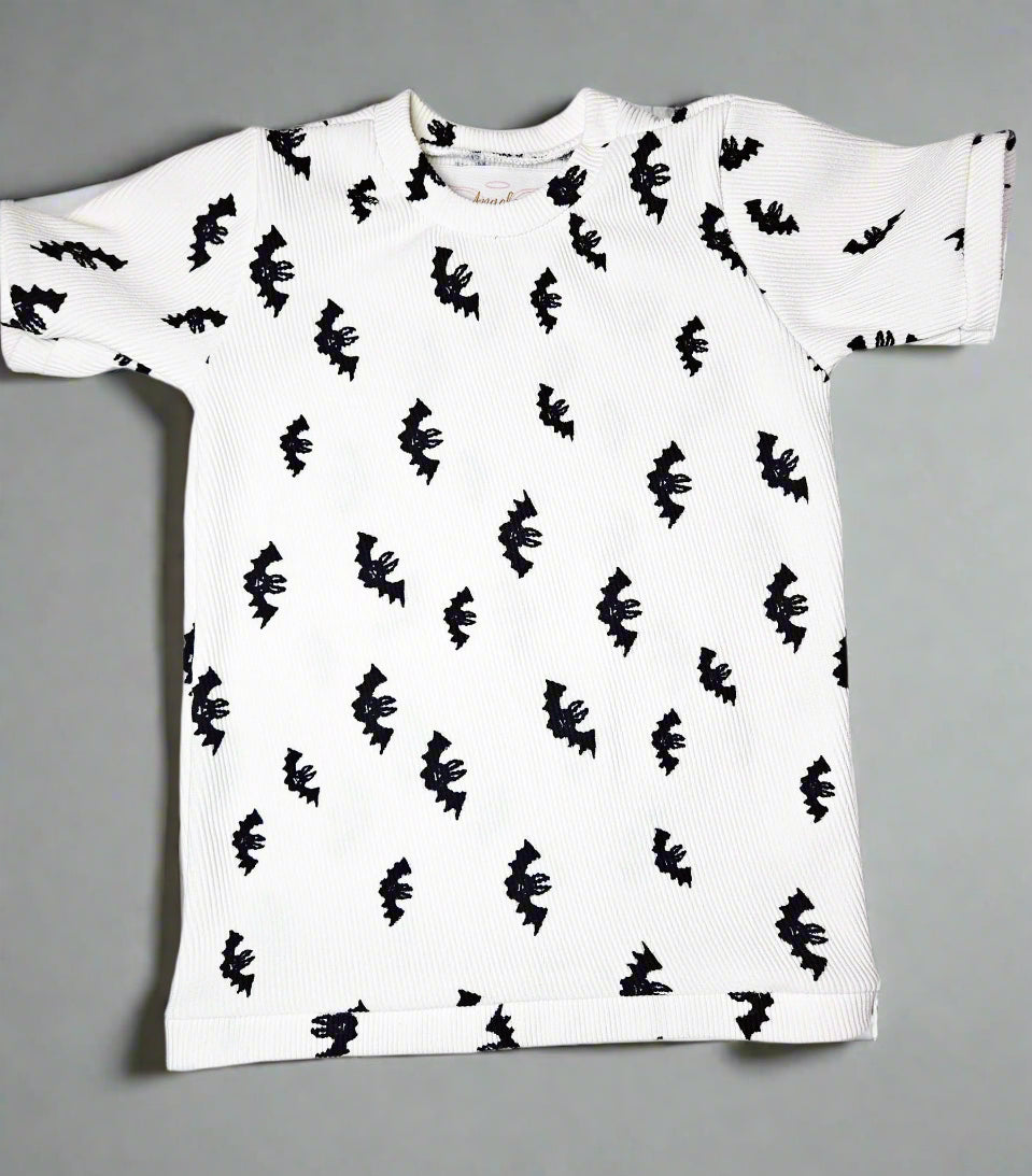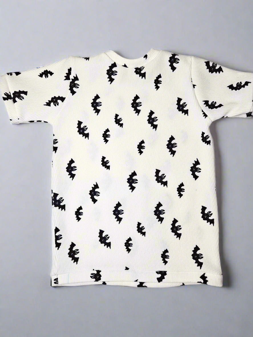 This playful Boy's Bat Pattern Casual Tee is inspired by our best-selling onesie, transformed into a comfy, stretchy top perfect for everyday wear. Made from deadstock fabric, it offers a cool feel and pairs perfectly as a twin with the onesie. Grab yours now—once it’s sold out, it won’t be restocked!